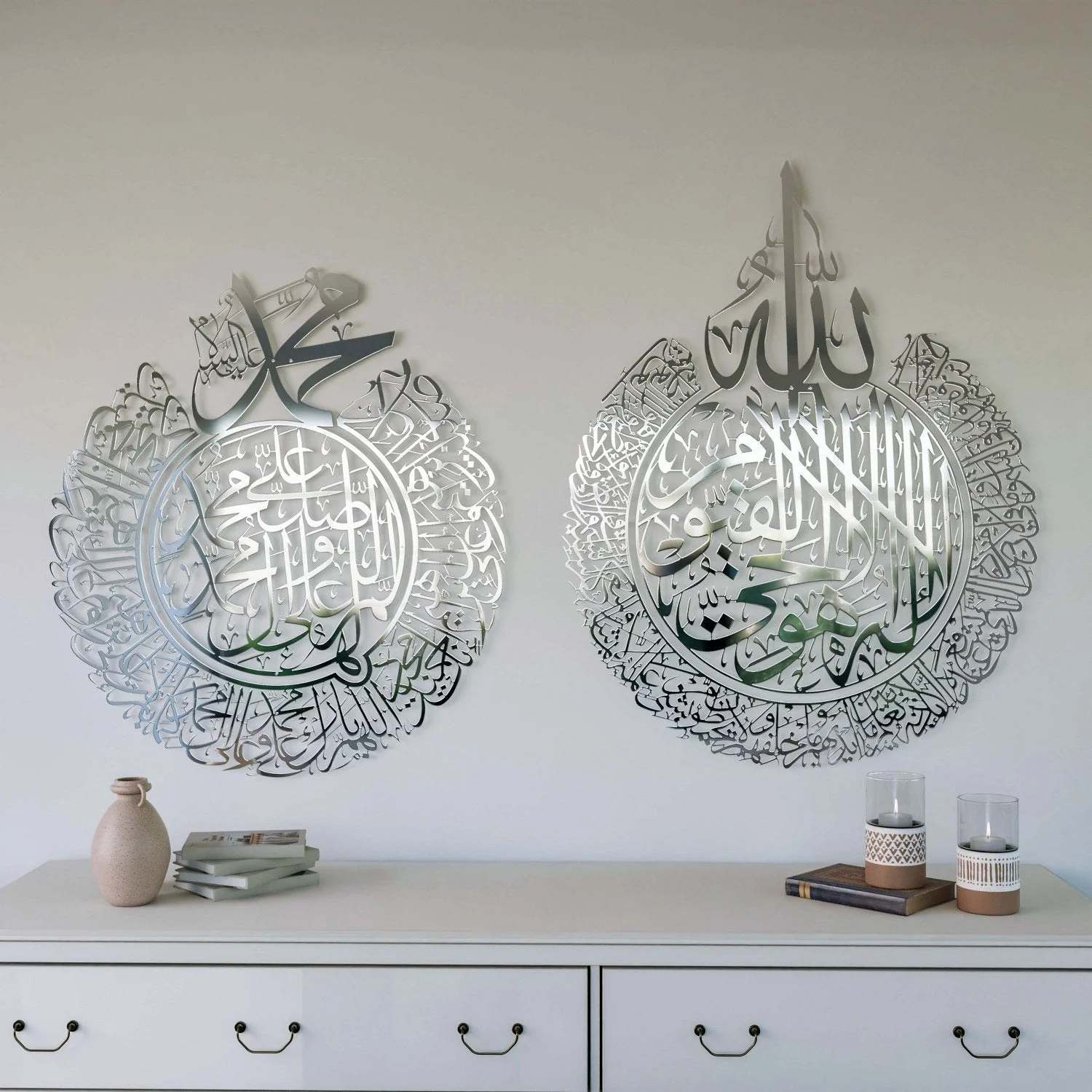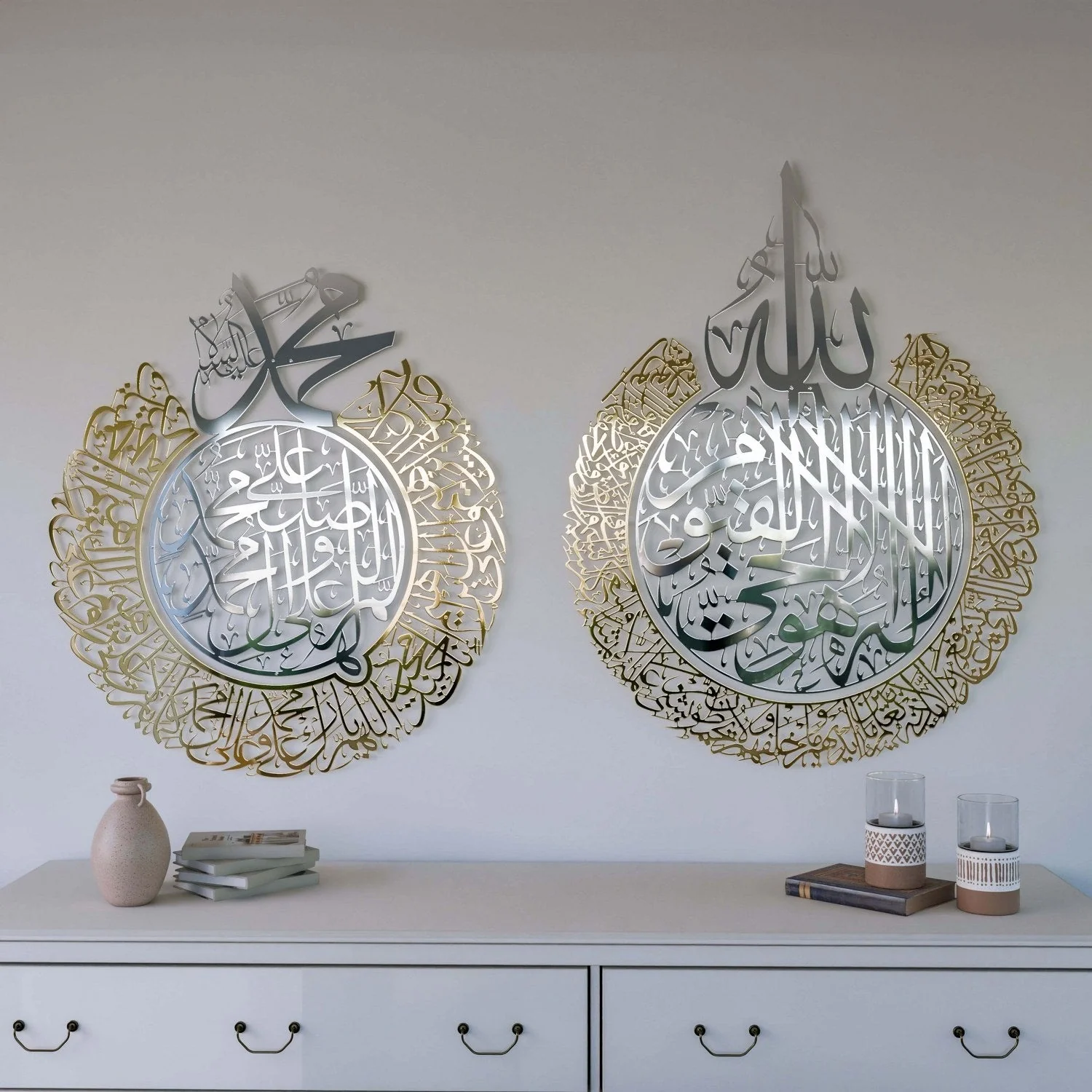 The Ayatul Kursi and Allahumma Salli-Barik Dua set is a masterpiece home decor piece that beautifully blends Arabic calligraphy with Islamic elegance. This shiny metal set includes two circular wall arts, each featuring one of the most frequently recited duas in daily life. One piece showcases the Ayatul Kursi, a powerful verse of protection, while the other features the Allahumma Salli and Barik Dua, recited as a blessing upon the Prophet Muhammad ﷺ.