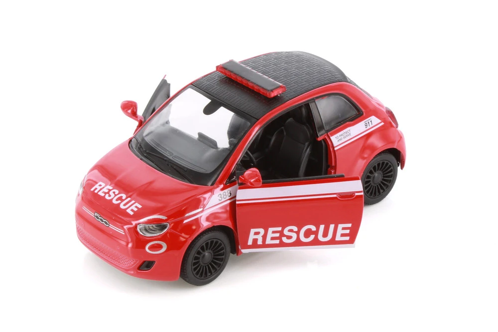 KiNSMART FIAT 500e Police & Firefighter Rescue Edition | 1:28 Scale Die-Cast Metal Model Car | Pull-Back Action, Openable Doors – KTS440DPR (EOS Series)